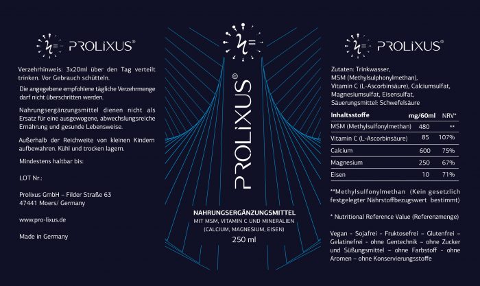 Prolixus enthält MSM, eine Schwefelverbindung, die Sie nicht über die Nahrung aufnehmen können, sowie Eisen, Vitamin C, Magnesium und Kalzium. Gemeinsam unterstützen diese Inhaltsstoffe ein gesundes Immunsystem, verbessern die Durchblutung und fördern Zellwachstum und -reparatur.